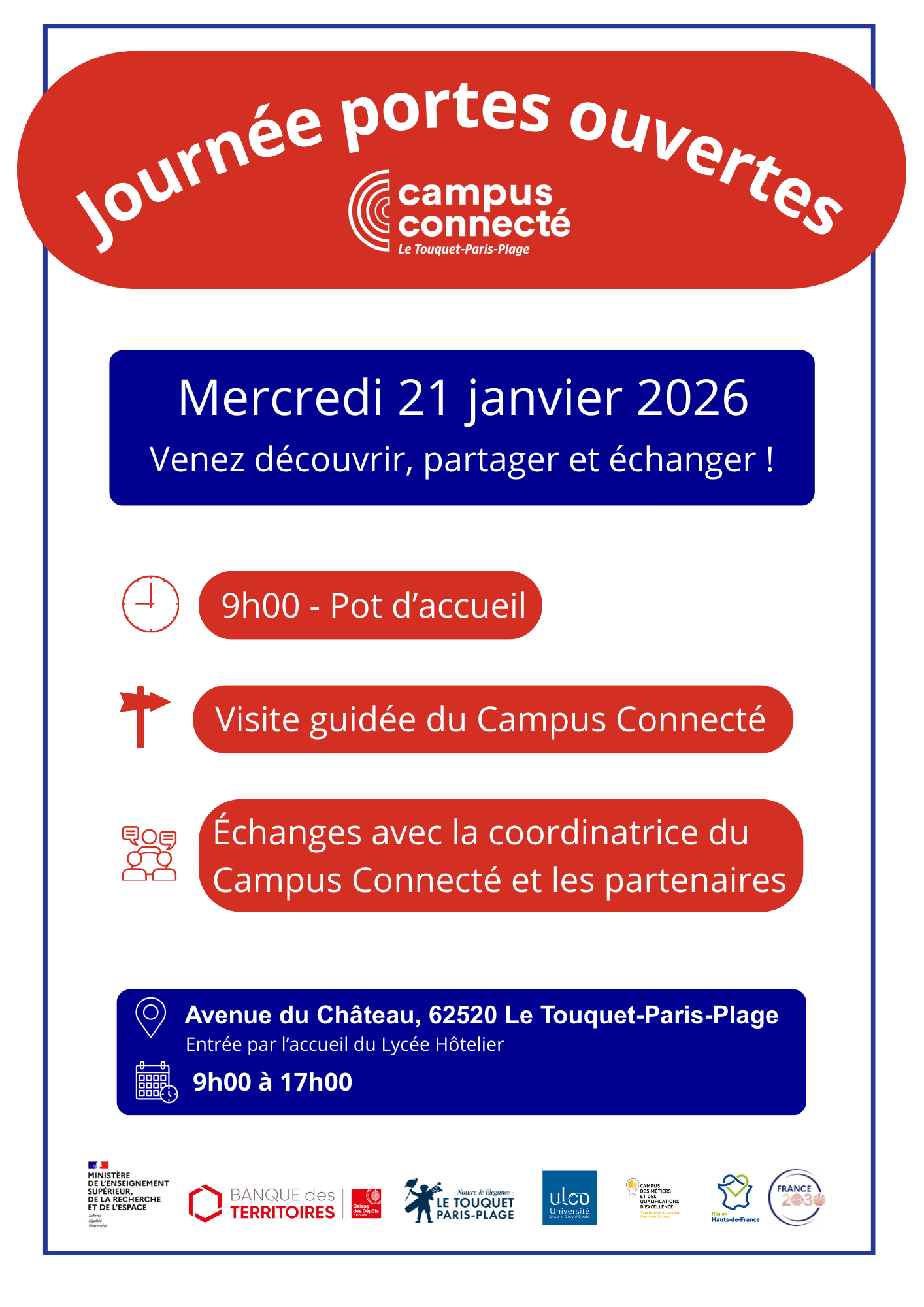 Le Campus Connecté du Touquet vous accueille à l’occasion de sa journée portes ouvertes ! Mercredi 21 janvier 2026 de 9h à 17h Lieu : Avenue